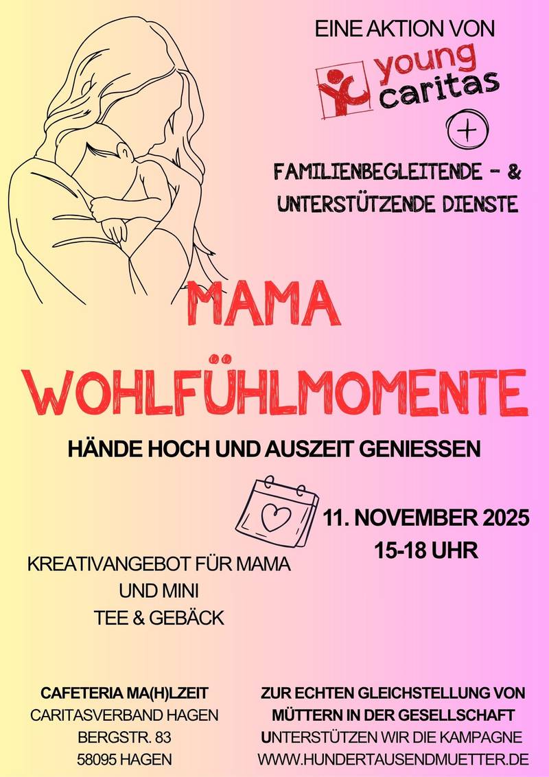 Am 11. November 2025 laden die Familienbegleitenden und - unterstützenden Dienste und die youngcaritas Hagen alle Mamas herzlich zu einem ganz besonderen Nachmittag ein: Unter dem Motto ,,Mama Wohlfühlmomente" steht alles im Zeichen von Entspannung, Austausch