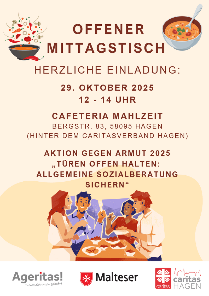 Am Mittwoch, 29.10.2025 laden wir in der Zeit von 12-14 Uhr gemeinsam mit dem Malteser Hilfsdienst, Ageritas Dienstleistungen und Werner-Ruberg-Haus zu einem Offenen Mittagstisch in die Cafeteria Mahlzeit (Bergstr. 83, 58095 Hagen / hinter der Caritas-Geschäftsstelle) ein. Der Offene Mittagstisch findet im Rahmen der bundesweiten Aktionswochen zur Beseitigung von Armut und unter dem diesjährigen Motto „Türen offen halten – Allgemeine Sozialberatung sichern“ statt. Wir möchten damit einen Ort der Begegnung schaffen – offen für alle, die sich für soziale Gerechtigkeit in unserer Stadt interessieren, austauschen oder einfach gemeinsam essen möchten. Es gibt warme Suppe und Getränke. Dies darf auch gern ausgehängt, geteilt und weitergeleitet werden, wir freuen uns über die Teilnahme!