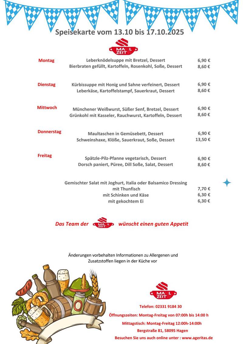 Vom 13.10 bis 17.10 laden wir herzlich zu unserer Oktoberfestwoche ein. Freuen Sie sich auf typisch bayrische Gerichte wie: