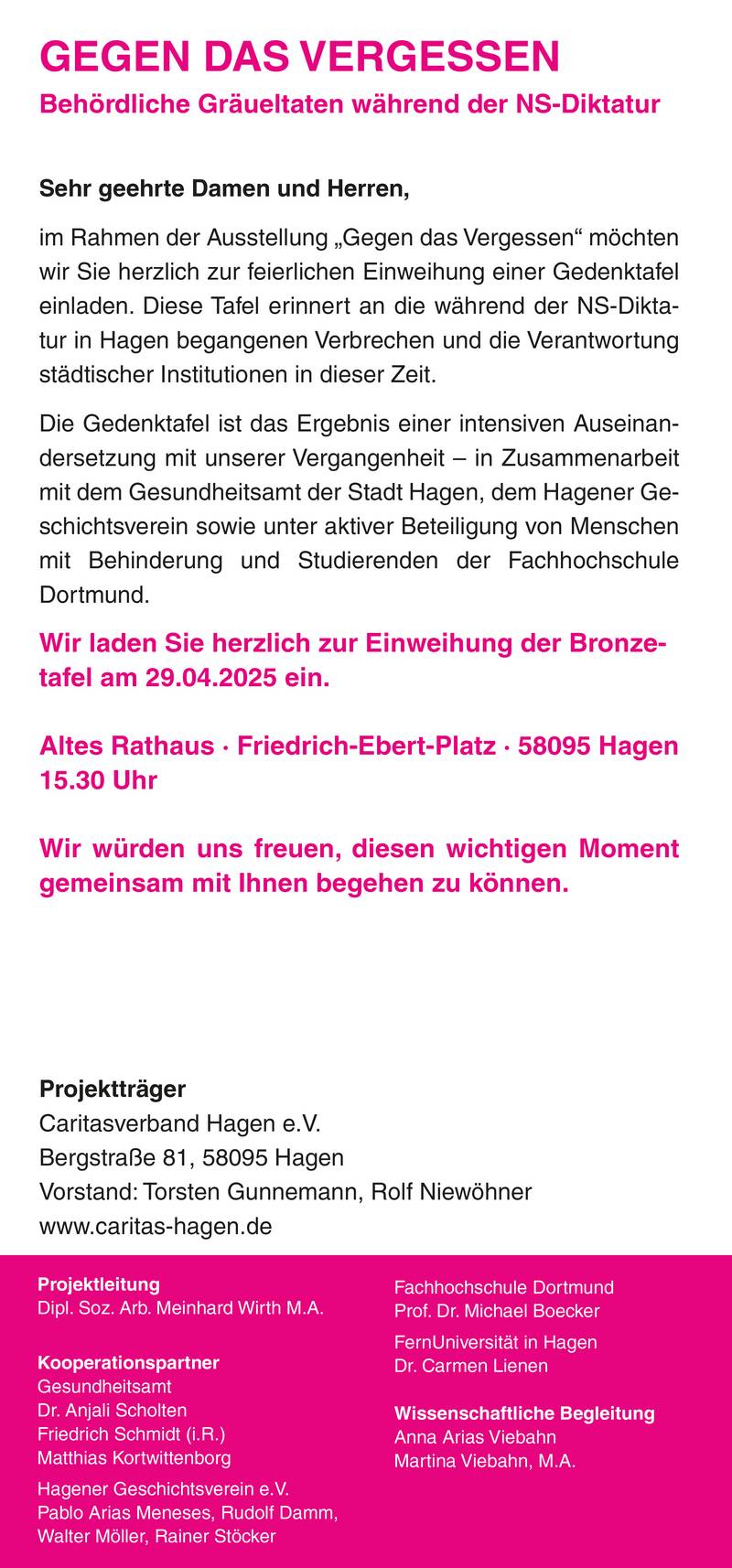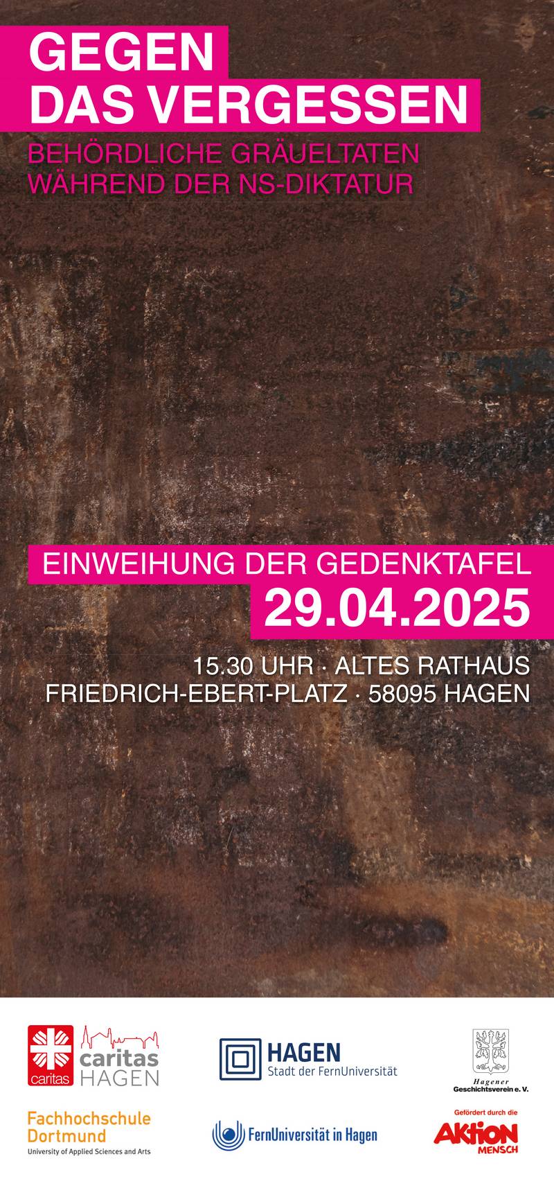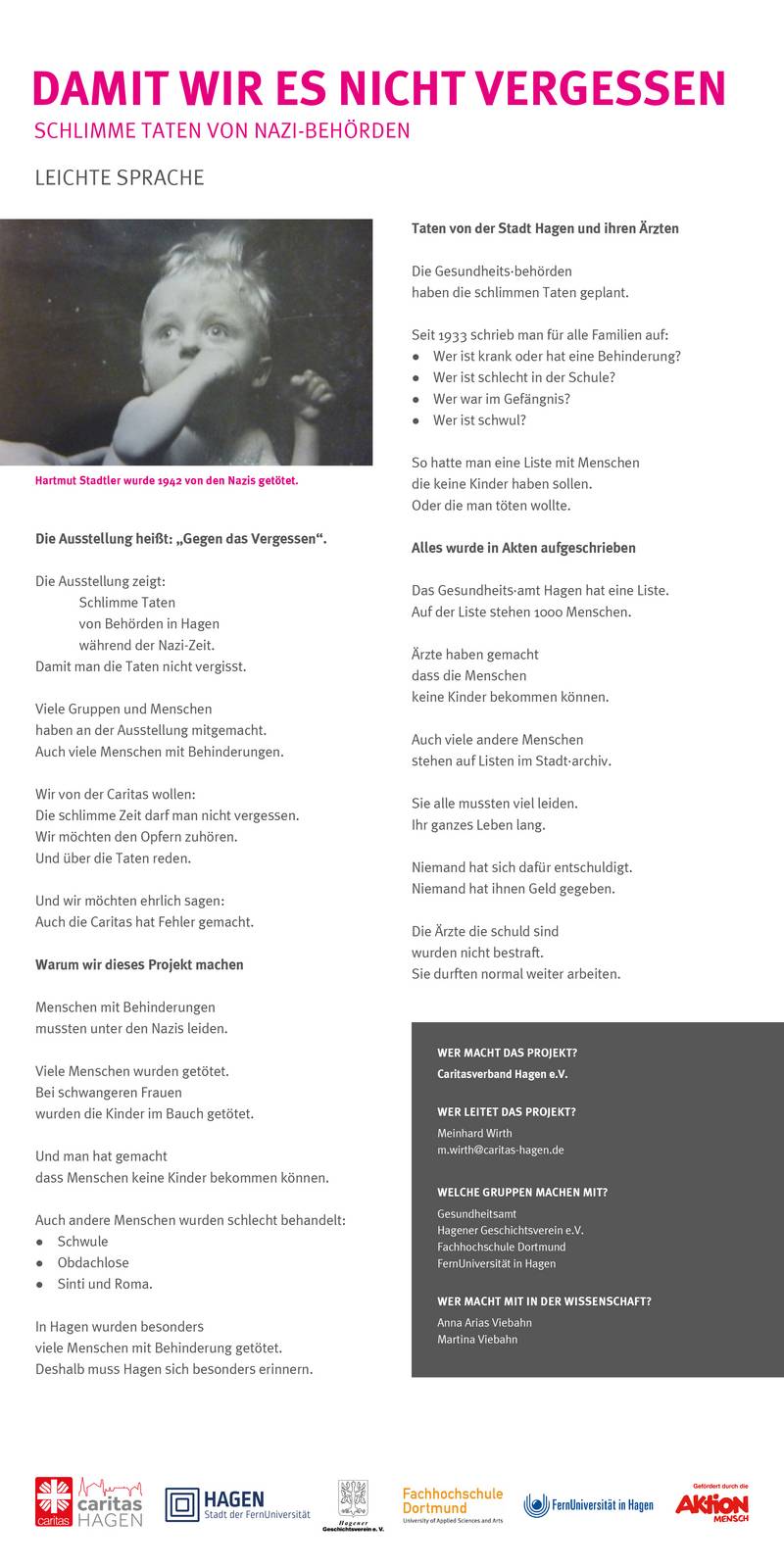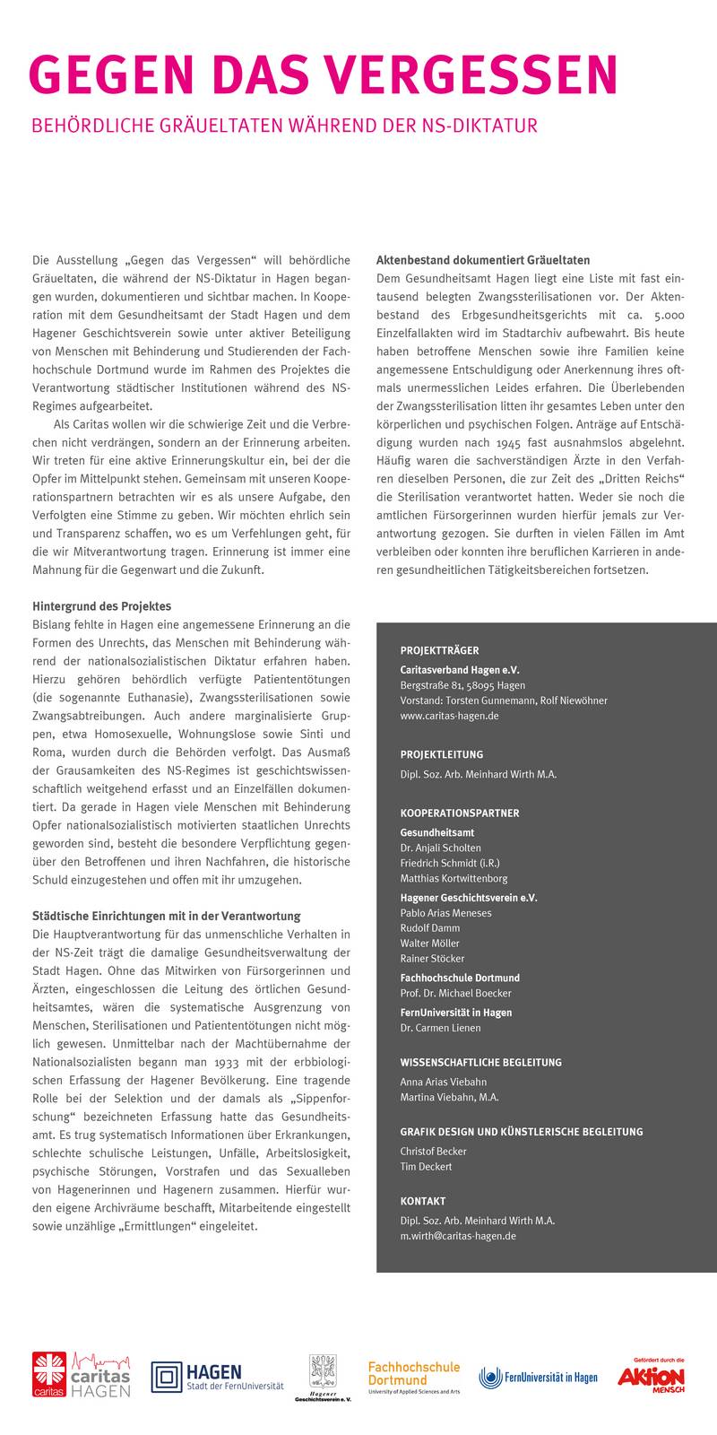 Menschen mit Behinderung ist während des NS-Regimes durch behördlich verfügte Zwangssterilisation bzw. Tötung unermessliches Unrecht widerfahren. Gemeinsam mit Menschen mit Behinderungen und Hagener Schüler*innen soll ein Gedenkort in Hagen an zentraler Stelle geplant und gestaltet werden und eine Ausstellung zum Thema konzipiert werden, um die Erinnerung an das Geschehene Unrecht in das Bewusstsein der Öffentlichkeit zu bringen.