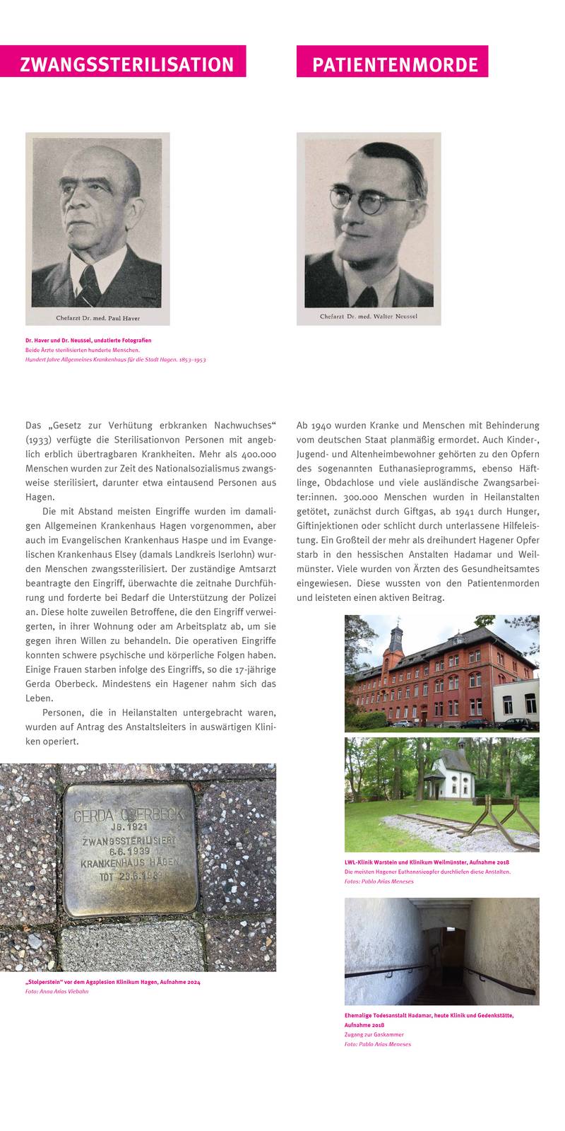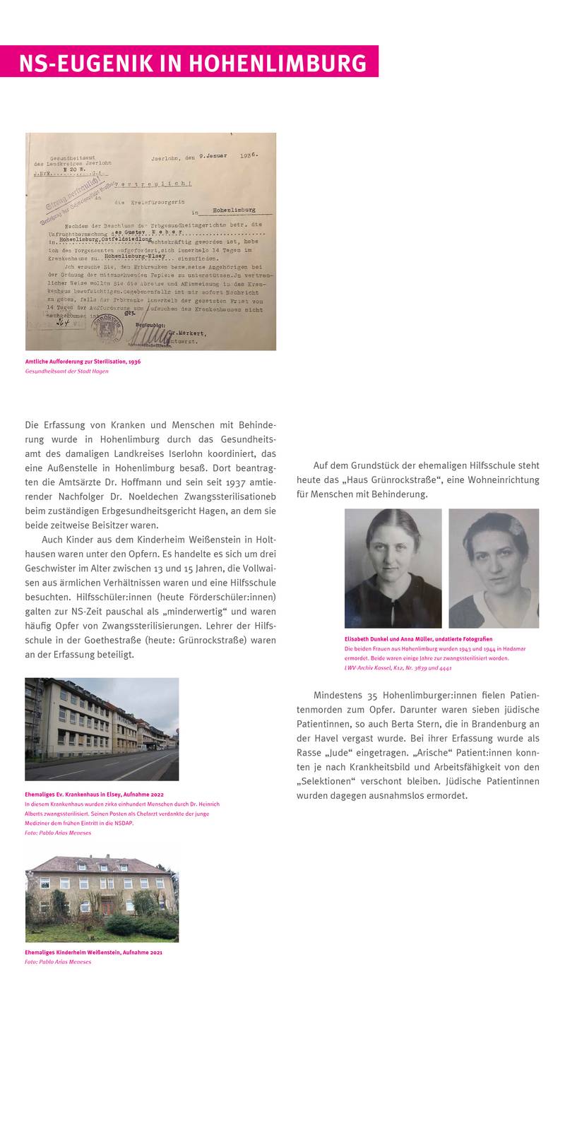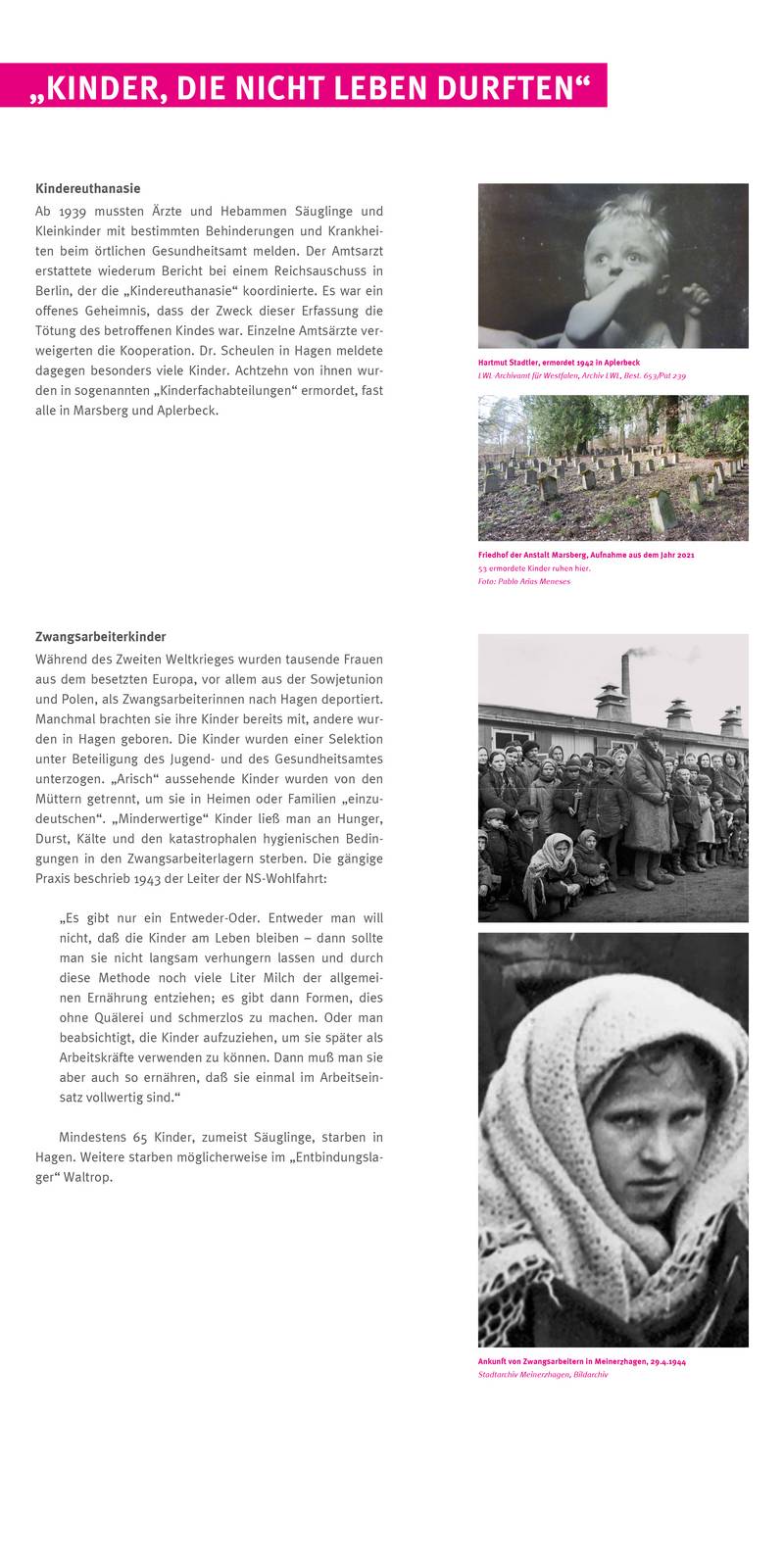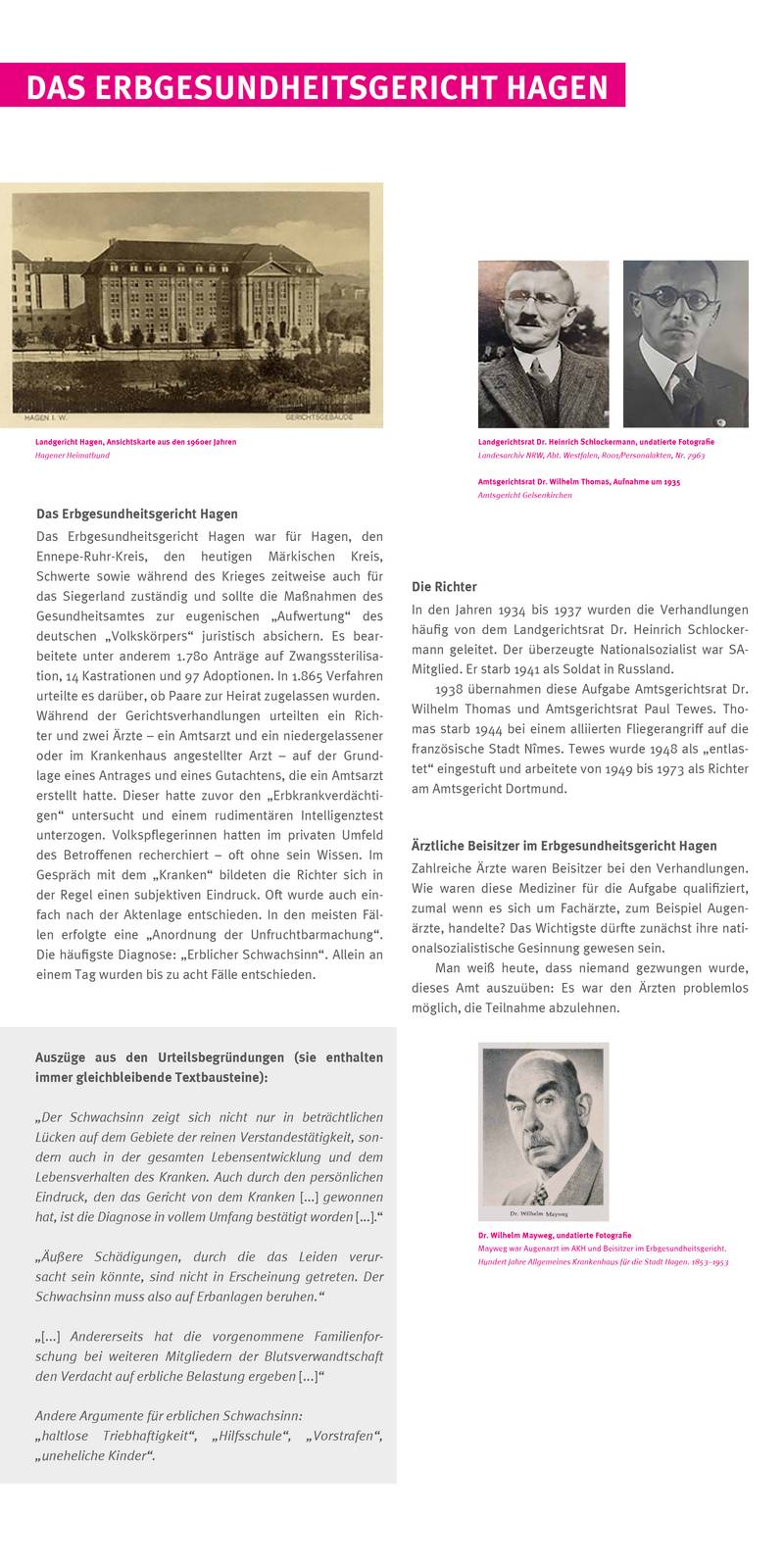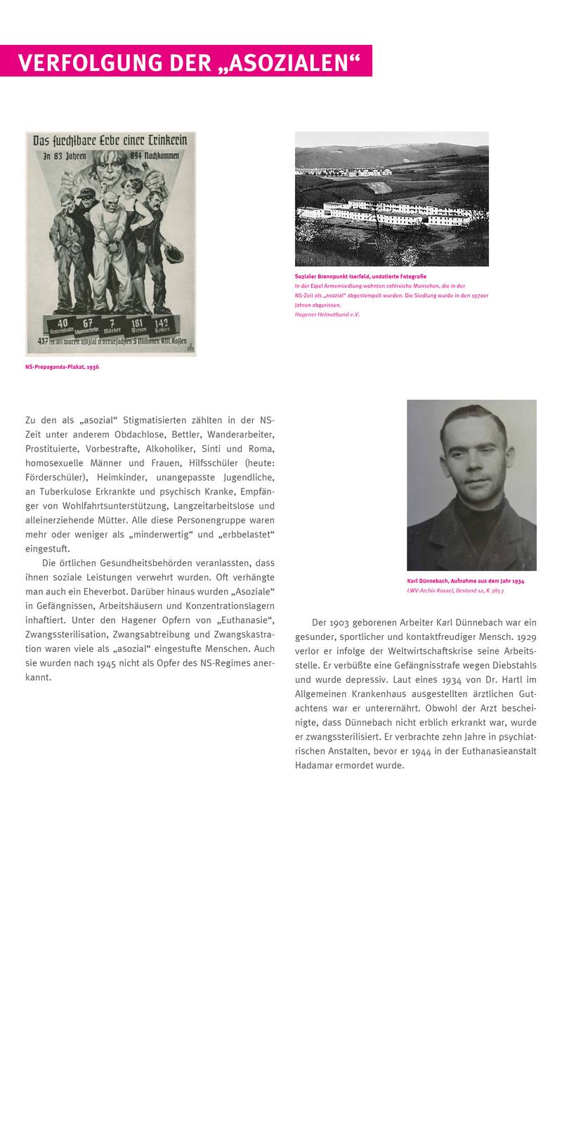 Menschen mit Behinderung ist während des NS-Regimes durch behördlich verfügte Zwangssterilisation bzw. Tötung unermessliches Unrecht widerfahren. Gemeinsam mit Menschen mit Behinderungen und Hagener Schüler*innen soll ein Gedenkort in Hagen an zentraler Stelle geplant und gestaltet werden und eine Ausstellung zum Thema konzipiert werden, um die Erinnerung an das Geschehene Unrecht in das Bewusstsein der Öffentlichkeit zu bringen.