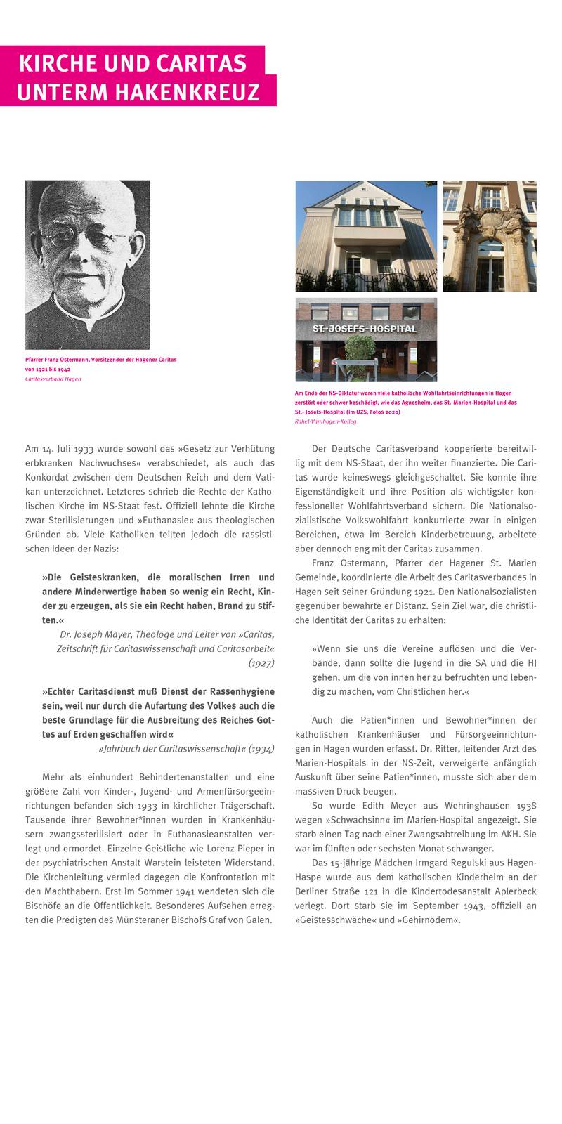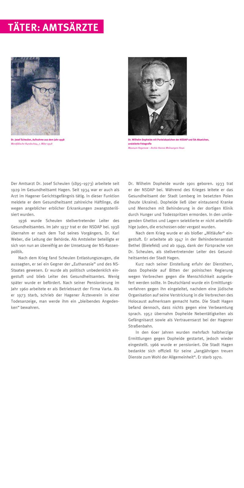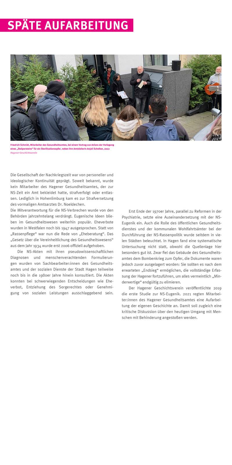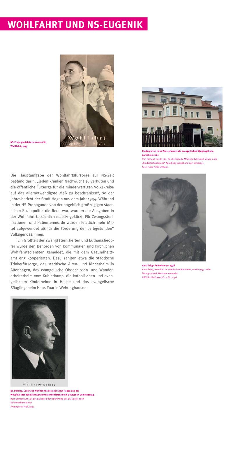 Menschen mit Behinderung ist während des NS-Regimes durch behördlich verfügte Zwangssterilisation bzw. Tötung unermessliches Unrecht widerfahren. Gemeinsam mit Menschen mit Behinderungen und Hagener Schüler*innen soll ein Gedenkort in Hagen an zentraler Stelle geplant und gestaltet werden und eine Ausstellung zum Thema konzipiert werden, um die Erinnerung an das Geschehene Unrecht in das Bewusstsein der Öffentlichkeit zu bringen.